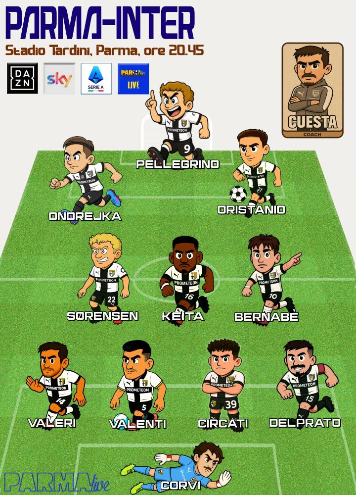 LE ULTIME DA PARMA - Cuesta in conferenza ha parlato di continuità ed è lecito aspettarsi un 4-3-3 molto simile a quello che ha sfidato il Sassuolo, anche se qualche cambio è sempre possibile (Estevez per Ondrejka con Bernabè trequartista?). Nel caso fosse pre-tattica, la scelta più logica sarebbe riproporre il 3-5-2 con Britschgi titolare al posto dello svedese, con Oristanio al fianco di Pellegrino e il solito centrocampo con Keita, Bernabè e Sorensen, le cui dote atletiche saranno comodissime in una sfida del genere. A sinistra c'è Valeri, in difesa spazio a Valenti, Circati e Delprato, mentre Corvi vivrà un'altra gara da titolare nel 'suo' Tardini.