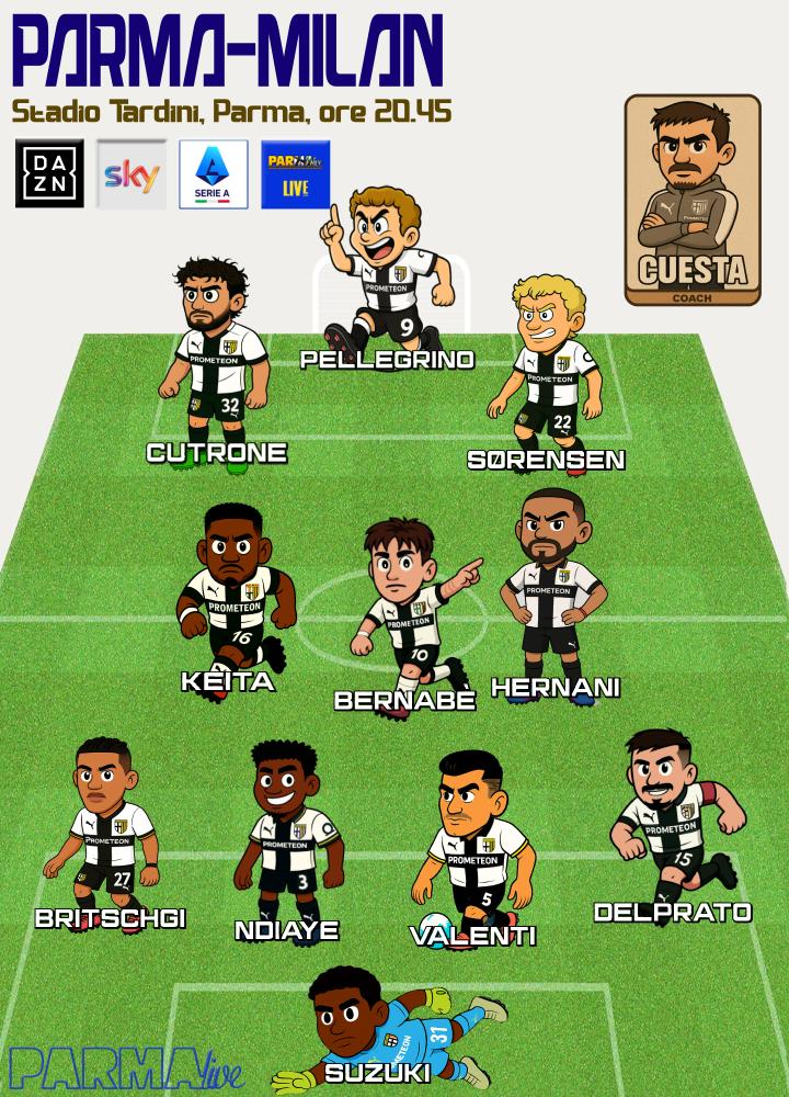 LE ULTIME DA PARMA - Dubbio modulo per Cuesta, che potrebbe anche decidere di mettersi a specchio grazie al recupero di Valeri, che potrebbe essere titolare a sinistra al posto di Britschgi. In caso di conferma del 4-4-2, toccherà a uno tra Sorensen ed Hernani salire a supporto della coppia Cutrone-Pellegrino, mentre Bernabè potrebbe adattarsi a giocare davanti alla difesa, con Keita e uno tra danese e brasiliano al suo fianco. In difesa senza Circati dovrebbe essere Ndiaye ad affiancare Valenti, con lo svizzero e Delprato sulle corsie, mentre Suzuki sarà ancora il titolare in porta.